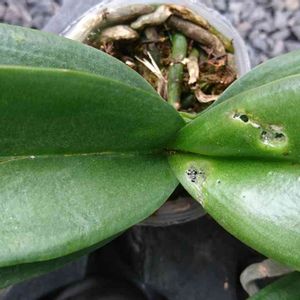 胡蝶蘭の暴れた根っこが葉っぱの上に、おっ🎵元気~っ😙と思ったらデッカいナメクジがお食事中でした。2箇所も食べたておりました🤕。ナメクジよ‼️(お持ち帰りだったら軽減税率8%のナメちょんぱ✂️の刑、OR 外食による通常税率10%のナメちょんぱ✂️の刑)×2箇所食いの現行犯。 ナメクジであるが故のいつものちょんぱの刑✂️とはちょっと違うぜ❗もう、ちょきちょきの刑に処すったぜ🔥🔥🔥。胡蝶蘭よ🤕、めげずに立ち直っておくれ🙏🙇。