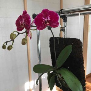 今日のお花のコチョウラン😄 我が家のコチョウラン群はまだこういう状況🖐 もうすぐ開花しそうなのはこの子たち 晩秋から花芽が出てゆっくりゆっくりステムが伸びています。 右が愛しのレース縁取りの蝶々のような ファレノプシス ミラクル Phalaenopsis Miracle 左が主人が会社で放置されていたのを持ち帰った元ミイラ状の赤紫の胡蝶蘭(品種名不明) 秋までは窓辺で。秋からずっとこのLEDの側に置いて下から加湿器炊いて大事に育ててます。 LEDと上からのレフ球で発色がどうなるかだなぁ🤔 水苔の適度な湿り具合にも気を配ってます。花数が少しでも増えますように〜🙏開花が楽しみです🎶🌸🌸🌸