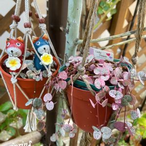 🏷ネックレスの日 参加します 斑入りのハートカズラ レディハートさん🌸 ⬅️我が家にいた子で ➡️rumirumiさんから頂いた子 パールアカシアさんの枝にぶら下げて ゆらりんこしております プルメリアのお花を抱えた 木彫ニャンコを添えて💕