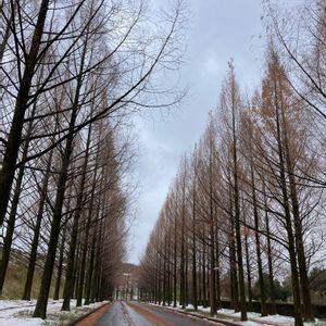 メタセコイヤの並木路🌲🌲🌲 歩道には雪がうっすら積もってる❄️⛄️❄️⛄️❄️⛄️❄️⛄️❄️