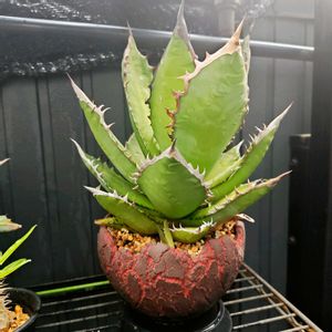 イナバウアーしてる斑入りの葉が きれいなアガベ😊✨✨ 「中斑龍舌」ってネームプレートがついてますが 洋名はアメリカーナ・エクスパンサ・メディオピクタ・パリーダでしょうか?🤔 大鉢、子株がいっぱい〜╰(´ิ∀´ิ)╯ヒャホー 🚗だったからよかったけど😊 🚃でも…持ち帰ってそう〜🤣