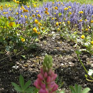 こんにちは😄… ルピナスさんが やっと咲きはじめました😋… 昨年よりは小さいですが オオデマリさんの木🌳の下で半日陰を作ってもらってます🤗💕… アジュガ & ゴールドコインさんも いっぱい広がってガーデニングって楽しいです😁♪♪…