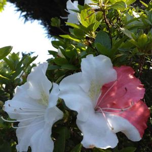 おはようございます😄… 今日は曇り☁空… そしてもう少しで雨が降ります☔… 庭の 白いツツジですが1/3ほど赤い花がありました😋… なんか不思議です🤔?
