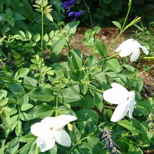 おはようございます😄… my花壇のメドーセージさんと ジャスミン(ホワイトプリンセス)さんです😉… 紫の側に白い花が咲いてくれるのが楽しみです👀~💕