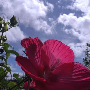 おはようございます😄… 庭のタイタンビカス🌺さんと青空☁です😋… 台風が来てますが進路に近い方は注意してくださいね😅💦 まだまだタイタンビカス🌺さんは 元気に咲いて癒やしをくれてます(*^^*)♡