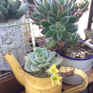 おはようございます(^-^) 黄色いチャイポットに 黄色いお花が咲きました。 多肉ちゃんのお花は どれも 小さくて可愛いですね〜😊