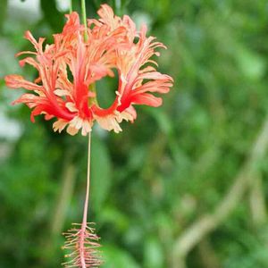 フリルが可愛いフウリンブッソウゲ💕 コーラルタイプのハイビスカスのママだそうです。 ぶら下がってんだけど 空中浮遊してるみたいで不思議な魅力✨
