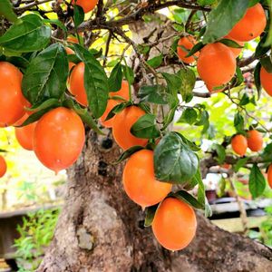 柿の盆栽その2 トキワガキ(常盤柿) 柿なのに葉が常緑です。 かわいい柿の実がたくさん 大きさはうずらの卵よりやや小さいです。