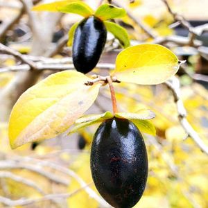 柿の盆栽その3 ロウヤガキ (老爺柿/老鴉柿) 黒鳳 (こくほう)という品種 漆黒の実と黄葉のコントラストが美しい