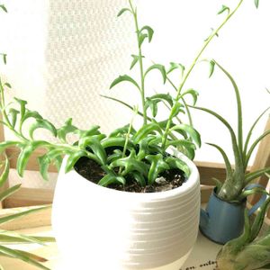 ひょろひょろ* この冬たくさん伸びたドルフィンネックレス✧ 先の方はひょろひょろで葉と葉の間もスカスカ。 切り戻しかな〜 鉢も小さいな〜 元気だからもう少し暖かくなるまで頑張って〜 イルカの葉は見てると自然と笑顔になれるから大好きな子♡