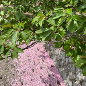 散歩コースの中で一番遅い🌸 ここもそろそろ終盤かなと行ってみた 一昨日の雨の重さに かろうじて負けなかったように残る花びら🌸 八重の桜の下 人の踏めない場所の絨毯は厚盛🌸🌸🌸 4月21日 🤳