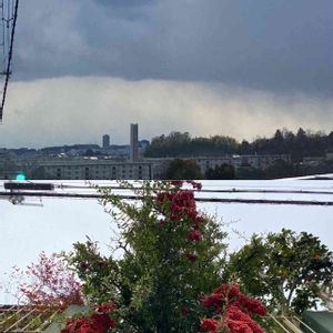 坂道をのぼるのぼるのぼる 高い場所に大きなお宅がたち並ぶ道端 …お花見上げ隊‼️ 雪の撮影にも成功😉 振り返ると いつもいろんな花木を見せていただいている集合住宅の向こうに 迫ってくる雪雲🌨🌨🌨