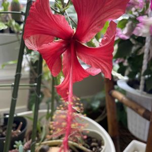 🌈アポロダブル🎉🎉🌈 1枚目pic 上 アポロダブル💕 蕾が開くのもゆっくりで 蕾もなかなかつかない方 今年初めての花が咲いてくれました。 八重咲きで 独特の雰囲気💝 ハイビスカスカウント 204💕 2枚目pic 毎度おなじみルークワン🐶 お気に入りの場所は ソファの背もたれ上💦💦💦 おかげで背もたれクッション潰れて安定感増して居心地良さげ💦💦 3枚目pic ザミの新芽がニョキニョキ⤴️ 4枚目pic カラテアサンデリアーナ 蛍光ピンクのラインがいいカラテアさん 冬場 加湿してたけど 葉っぱ縁からカリカリ🥹 もうダメか。。。って思ってたら 新しい葉っぱが出て 続き新芽も🎊🎊🎊 けど 葉っぱ すぐに縁から傷んでしまうのは 何があかんのやろ。。🥲 上手に育ててはる方 コツを教えてくださいませ🙏🙏