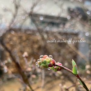ブルーベリーの新芽に水滴が٥٥ .。 つぶつぶかわいい♡