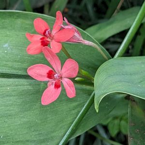 ヒオウギと名のつく花3種の最後の花ヒメヒオウギズイセンがやっと咲いたので、まとめて投稿します。 全てアヤメ科で名前は似ていますが、個性はかなり違います。 2枚目ヒオウギは、葉が見事な扇型に広がるカッコイイ草姿です。 3枚目ヒメヒオウギは、属名から分かる様にフリージアの仲間で、この3種類の中では最も小型で可愛いです。 4枚目ヒメヒオウギズイセンは、葉がしなやかで、伸びた花茎に沢山の花が着きます。