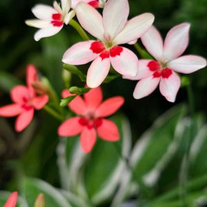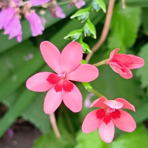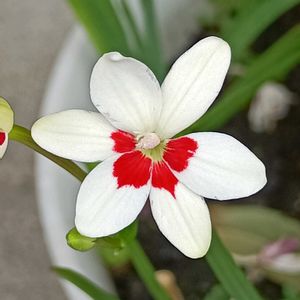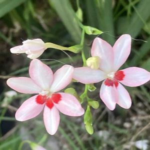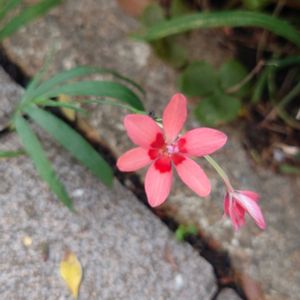 ヒメヒオウギ(姫檜扇) フリージア ラクサ (ラクサは「まばらな」という意味) 友人にもらった鉢植えから、あちこちに零れ種で増えてます🩷❤️ 細長くてツンツンした葉に、直径2㎝くらいのちっちゃな花。 花びら6枚のうち下の3枚に、「虫🐝さん、蜜はココですよ〜❣️」という朱色の印❤️ (ネクターガイド)☺️ さらに、フリージアの仲間なので球根植物なのですが、種の殻に🐜が好むオマケをくっ付けて遠くの巣まで運んでもらっているとか🎁(殻を舐めた後、種はポイ捨て→発芽🌱🤔) そんなこんなの自助努力?が「実」を結び、わが家の小さな庭の広範囲に(ドッチヤネン🤣)地道に「まばらに」遠征して咲いてます🧚♀️ ٩(•ᴗ• ٩)fight⚐⚑⚐゛