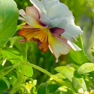アルス サブティリオール🌈 松原園芸さんのアンティークビオラ♡ いろんなカラーに目移りする中 オーロラ入ったこのコを選びました🌈👸 フリル花弁とは異なる 角のないギザギザ感も可愛い!🥰 ずっとこのままの発色で咲いてほしいけど 気温に影響されるパターンかしら🙄… 鉢に植えたオーロラ姫の侍従にと 真っ白でなく 少しクリーム色のアリッサムを寄植えました♡ 🌈👸🤵♪
