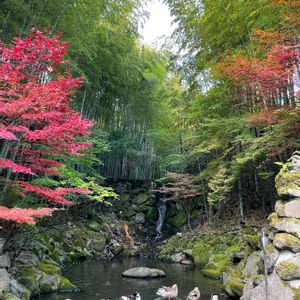 先日泊まった温泉宿竹ふえのガーデン。 竹林の緑と紅葉のコントラストが美しかったです。 鴨達が増えてました😊
