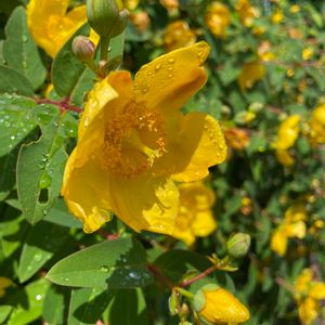 ラーメン屋さんの西側 セイヨウキンシバイの蕾と 雨の雫アップです✨