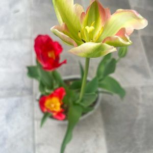 先日picの蕾✨だった八重咲きチューリップ🌷開花❇️です😊 やっぱり頭が重いようで、昨日からの強風で倒れちゃってます😰