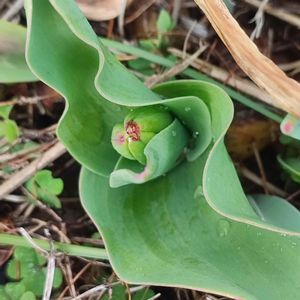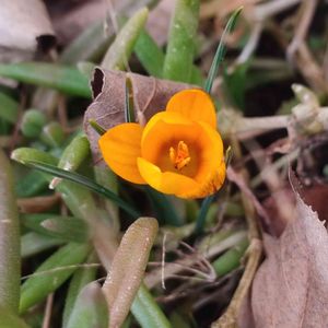 何か咲いてないかと探していると、ありました。 マツバギクの葉ですが、咲いているのは、クロッカスです。