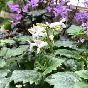 プレクトランサス モナパール 後ろが、モナパープル🪴 要約パールさんの顔🥸が出ました。 パールだから光り輝く⭐️純白💟を期待、 チョイと違う😅 口の中に少し点々と色が〜 日当たり悪いが、頑張ってくれ➰👏