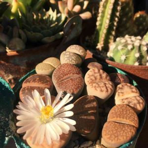 お久しゅうございます✨ なんと、2か月以上更新をサボりました💧 更新がストップしても、いいね!をくださった方々、ありがとうございます。 うにこは風邪気味ですが元気でした。 市内では台風19号の被害が大変なことになってしまいましたが、我が家は何の被害もなく…多肉棚が一つ、雨水の重みでひっくり返りましたが、水深2mの浸水被害に遭った方々に比べたら蚊に刺されたより軽度な被害でした。 10月末までハンドメイド方面が忙しく、ベランダに出ている暇がほぼありませんでした。 また週末の度に雨に降られて秋の植え替えもできず…昨日までの三連休は今まで遅れを取り戻すべく植え替えに励んでおりました。 picは品種名不明だけどグリーンで可愛いリトープス 。 今シーズン初のお花を咲かせてくれました。 持ち主が慌ただしく忘れ去っていたのに、咲いてくれてありがとう。