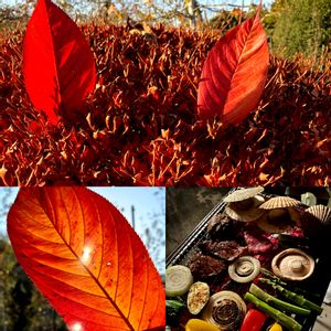 今日 自分の気持ちを上げるためにやって見た事。① 他人の家の植木にいたずら(笑)真っ赤な葉っぱで耳を付けてみたよ🤗②真っ赤な落ち葉をお日様に透かしてみたよ✨ 葉脈がすっごくキレイだった❤ ③娘の彼も呼んで庭で夜のBBQを楽しんだよ。彼は私を元気づけようとエビやホタテを茨城の市場で仕入れてきてくれた😄美味しかったぉーーー❗