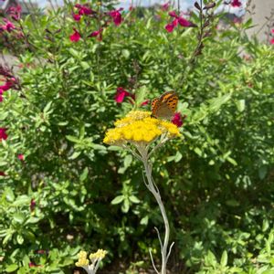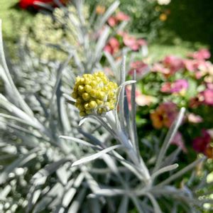 ■宿根草 ヘリクリサム・シルバースノー シルバーの葉っぱに花は鮮やかな黄色🌼 たまたま蝶?がきました♩