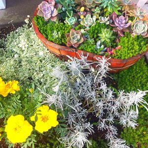 小さかったシルバースノーも、根付いてすっかり大きくなりました゚・*:.。. .。.:*・゜ シレネのお花が可愛い(❁´ω`❁)*✲゚* 多肉植物は個々に鉢植えしてたのを、見様見真似でプランターに*✲゚* すくすく成長しております♡