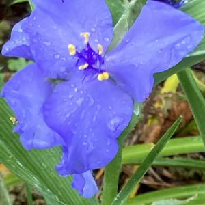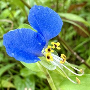 庭にツユクサが咲いていました。:.゚ 昨日の雨で雨粒をまとって… ブルーの花びら💙と 透明なガク♡ 飾りおしべと呼ばれる黄色💛も かわいいです𓍯·° 朝咲いて昼にはしぼむ はかない一日花さん 𓂃 𓈒ฺ 𓏸 ◌𓈒