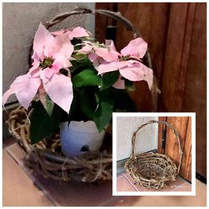 午後からは🥝の蔓で一人のんびり工作〜。籠🧺を作り上げ、プリンセチア4号鉢と合わせてみた^_^。蔓のみの編み込みは難しく断念、麻紐で縛る手抜き仕上げになってしまったが、初挑戦にしてはお気に入りの作品ができたかな☺️。