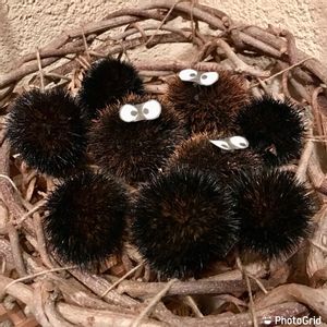 玄関外のこの籠🧺が空いていたので、まっくろくろすけを作り、飾ってみた😊。 収穫期を終えた栗🌰、空っぽのイガならばいくらでもある^_^💧。 アイデア💡くれたフォロワーさん、有難う🙏。