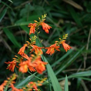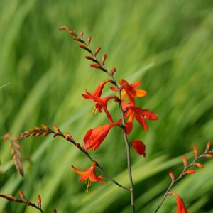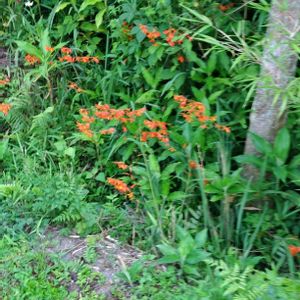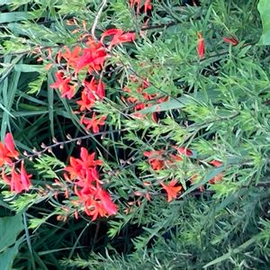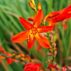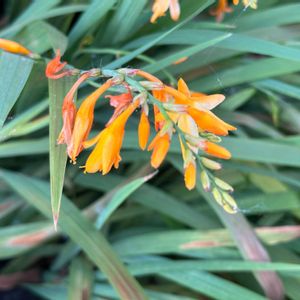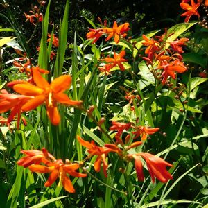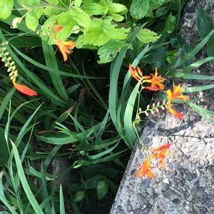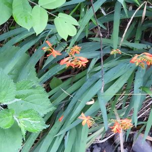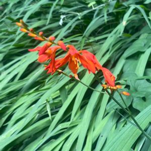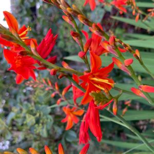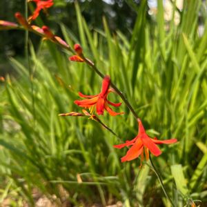 ヒメヒオウギズイセン(姫檜扇水仙)が咲いていました。 アヤメ科で、別名にクロコスミアやモントブレチアがあります✨ 鮮やかなオレンジ色🔶の花は、夏☀の花ですね💕😃