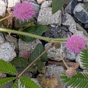 通り道で家と家の間に砂利土がひかれている処にオジギソウが群生してました。ピンク色のポンポン玉と触ったら痛い 棘があリました。