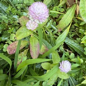 千日紅 こぼれ種で育った逞しい子です🩷 丸いピンク色のお花が 可愛らしいです🩷🤍 ̖́- 周りを見ると👀✨ 雑草(*¨*)?ぽい子ばかり💦💦 来年も逢えると良いなぁ〜💞🤍 ̖́-