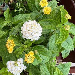 ランタナ 爽やかな色の子💛🤍 ̖́- 🌟⭐️💫丸いお花が可愛いです🌟⭐️💫 葉っぱの緑も素敵です💚⋆⸜💚⸝⋆ 最近の鬱陶しさを吹き飛ばして欲しい💗