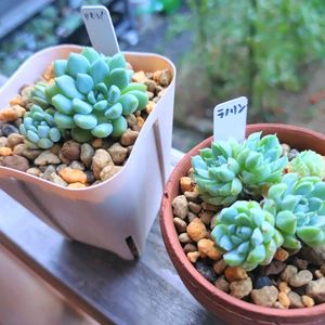 アモエナ。ラウ○○○と付く種類と同じだそう。 小さいエケベリアはいくらかあるけど、そのままミニチュアにしたような形が可愛くて購入。 群生にするんではなく株分けて極小鉢を買って、ミニチュア鉢植えにしたい。 暑くなってきちゃったから秋までおあずけかな。 鉢増し程度ならともかく、分けるまですると負担が大きそうだし。