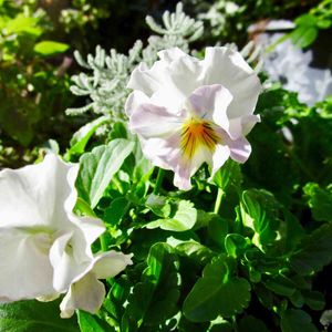 こちらが、左肩が、夢見るパンジー 右側は、モココ 寄せ植えに追加で植えたのが、夢見るパンジー。