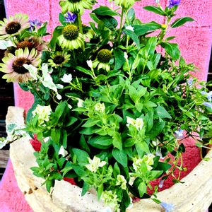 今日の夕方は風があり🎐 ただし…湿度は70%😅ザ盆地! ①Early Autumn in the Romantic🩷🤎💚💜🤍 一目惚れ😌💕したロマンチックな色と姿のHakusan セロシア ワイルドピンク🥰…ん~得も言われぬピンクとブラウンの茎♡ その手前にPWスーパートレニアカタリーナ🤍💜💙アイスリバーを添えてシンプルに😊 夏の代表ケイトウ(セロシア)×寒色のトレニアで涼を感じます🎐 そしてロマンチックな雰囲気で秋も先取り🌰…のイメージ🪴😁 非耐寒性の宿根草は、冬越しが厳しく可哀想になるので買わない🙅‍♀️🆖️と思っていましたが、色合いや草姿が素敵で✨お迎えしちゃいました😘🩷冬はビニルハウス出動かな?🤭 ②レディプリマスゼラニューム🏷️🌿(…センティッドゼラニュームの仲間) ローズペラルゴニウムの変種で、本来は斑入りらしく。葉っぱがローズの香りです✨エッセンシャルオイルにするタイプとのこと。 母が大切にしていた前の子が🪴が春…天国へ👼😢 たまたま見つけて連れ帰り🏠🚗💨🤗しかも、お得コーナーから💴🎵 このお店は、いいモノを仕入れていて、陳列していて1番✨美しいとお店で判断する時期を過ぎると即お得コーナーに置く方針みたいで🎶全然良いモノ多くて👀✨ 今回も運に恵まれ♡⛩️感謝✨ 花が終わったタイミングで切り戻したようで✂️とっても丈夫な株で枝張りも立派で葉の様子も(^^)b✨✌ 母も喜んでくれ☺来春が楽しみ~♫🩷 ③PWスーパーベルダブルレッド♥️ ナント!雪深い寒冷地(作業小屋)でも冬越ししたスーパー2年生✨🤗梅雨前に切り戻して✂️草丈も揃ってきて、花芽もびっしり…なのに、連日の暑さからか咲かない……🤔 必殺技でHB101とベニカファインを散布したら➰✨♥️♥️♥️✨ 深いカッコいい紅🥰冬を越した子だから尚更可愛く綺麗に見えて…親バカですね🤭 ④PWユーフォルビアダイアモンドフロスト🤍✨🌿 まさかの理想のモフモフ(ノ)•ω•(ヾ)🤍私の部屋で冬越しして2年生👑たったのひと苗🌱🐥から、1年でこんなに大きく立派に成長してくれるなんて~😭💝 1w.前にかなり鋤いて✂️空間を増やしたのですが😅➰あっという間に密集🤍🤍🤍(ノ)•ω•(ヾ) 嬉しい悲鳴🎵🤗やりがいあるぅ~ ➄母のバラ🌹🪴 名前…未だに分からず😅 真夏なのに咲いてしまい~💡❣️よく見たら、花びらの質感がベルベットみたいな👸 秋になったら、鉢増し植え替え🧤してあげよ~🤗 今晩は😋🌃🍴 ししゃも焼きと夏野菜🍆🫑🍅 今日も1日お疲れさまでした🍻😊