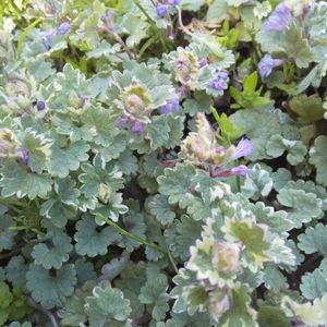 よく見かけますが 名前がわかりません。 グレコマ バリエガータと教えていただきたした。 グランドカバーとしてよさそうですね。 紫の可愛いお花が咲くそうです。 グリーンにピンクが入っているのもあります。🌿🌿 白入りはこの時期涼しげですが、🤍🌿 庭に蔓延ったら大変かしら