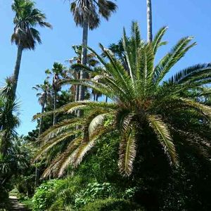 カナリーヤシ🌴…と宿木(紫陽花💠) 良く見ると、カナリーヤシの木の上の方に紫陽花が花を咲かせています✨凄い生命力を感じます。 苑内には他にも、桜や椿が生えているヤシの木もあって季節が来るとお花を咲かせるそうです💠💠 江の島 サムエル・コッキング苑にて。