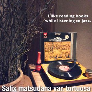 宿の客室には自分の背丈以上の雲竜柳があって圧巻です。ジャズのレコードもあり、アロマキャンドルを焚きながらお酒。