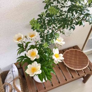 庭の芍薬を切って飾りました。アセビの枝もまだまだ元気です。