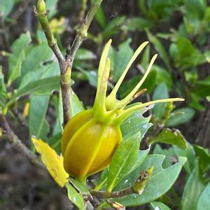 山茶花の垣根沿いにぐるっと回って歩いていたら、公園の植栽の間からチラリ🙄と見えた…🟡 烏瓜? とあたりの草をかき分けて近づくと 😳星の王子さま⭐️みたいな クチナシの実だった!