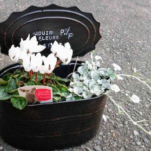 おはようございます🎵 黒のリメイク缶に白のシクラメンとシルバーの🌱合わせて見ました✨ 二新種ですが小さな寄せ植えまずは完成です☺️