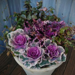 リビングから見える花台の上には小さめの寄せ植えなどを並べて楽しんでます♩ 今年の葉牡丹はスパークリングロゼ🍷