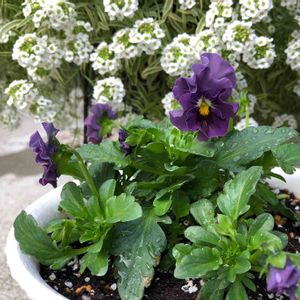 寄せ植えの極小輪ビオラ フィーリーと見元さんのクローバーがいい感じ🌸