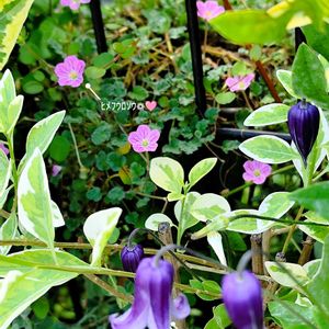 西側フェンスの外側と、内側 内側のヒメフウロソウ❁🩷 (ハンギング植え)が、 外側に飛び出して😉 クレマチスローグチ❁💜と 斑入りの葉は、ツルハナナスの葉 (地植え) ②ヒメフウロソウ❁🩷