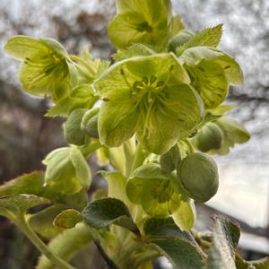 原種系クリスマスローズのアーグチフォリウス スターダストが開花❣️ GS友さんの所で拝見した原種系クリスマスローズ💕 長〜い名の🏷️・原種系・綺麗な斑入りの葉が気になって🔍〜🤔 梅花の様な淡緑色のお花を一枝に20〜30個も咲かすとの結果に想いが募って募って出会えて付いてた蕾が昨日からの雨に開いたのでGS友さんへ報告を兼ねての📮INです〜🎶😍